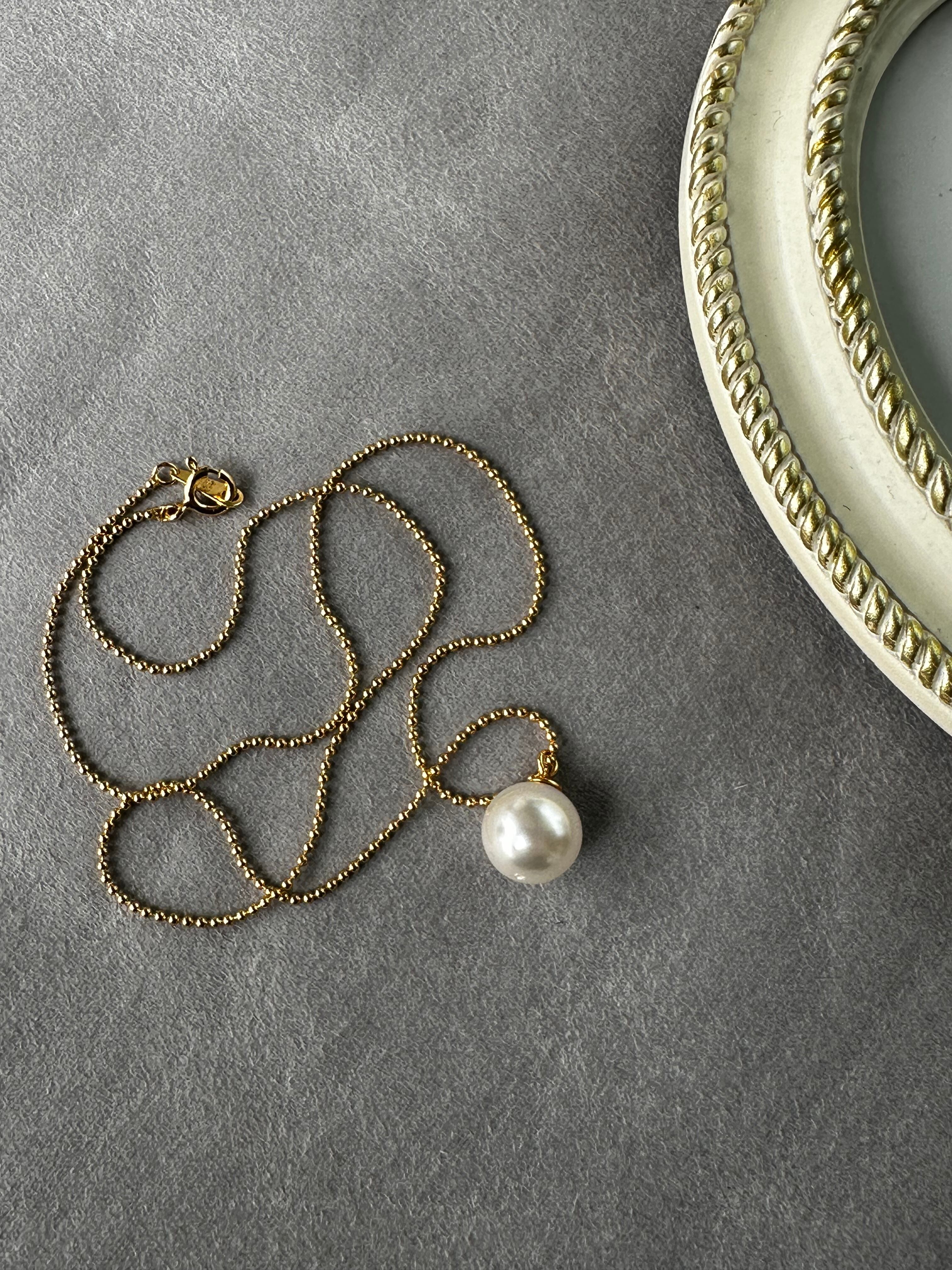 存在感ある大粒パールに、繊細なゴールドのミニボールチェーンを組み合わせた上品なデザイン。